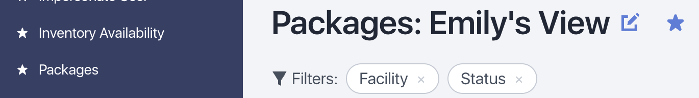 In the example below, only Packages is visible in the favorite section in the navigation menu, despite a custom view saved as Emily's View. Setting this saved view as the default view for the user will display this view automatically when Packages is selected.