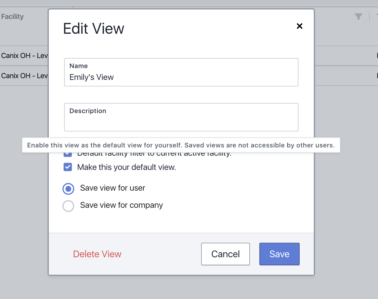 - Default facility filter to current active facility - select this option when the view should auto-update the facility filter to the currently selected facility. This is best if viewing the saved view across multiple facilities to not have to re-select the correct facilities in the filter each time.