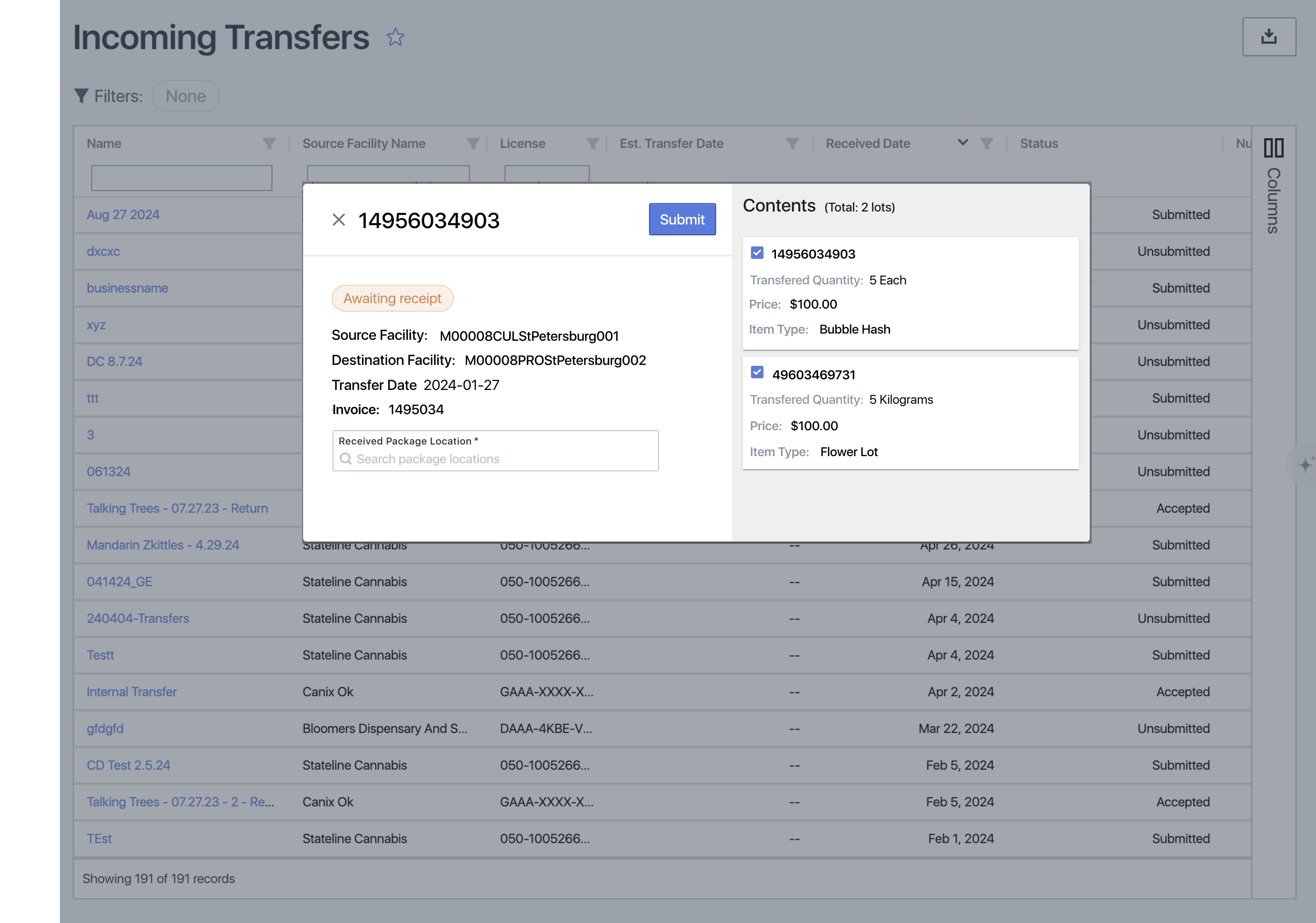 A full package must be accepted or rejected currently, but an incoming transfer can have whole packages accepted and whole packages rejected on the same transfer. Portions of a package can be accepted and rejected for the same package in BioTrack Florida, but are not currently supported in Canix.