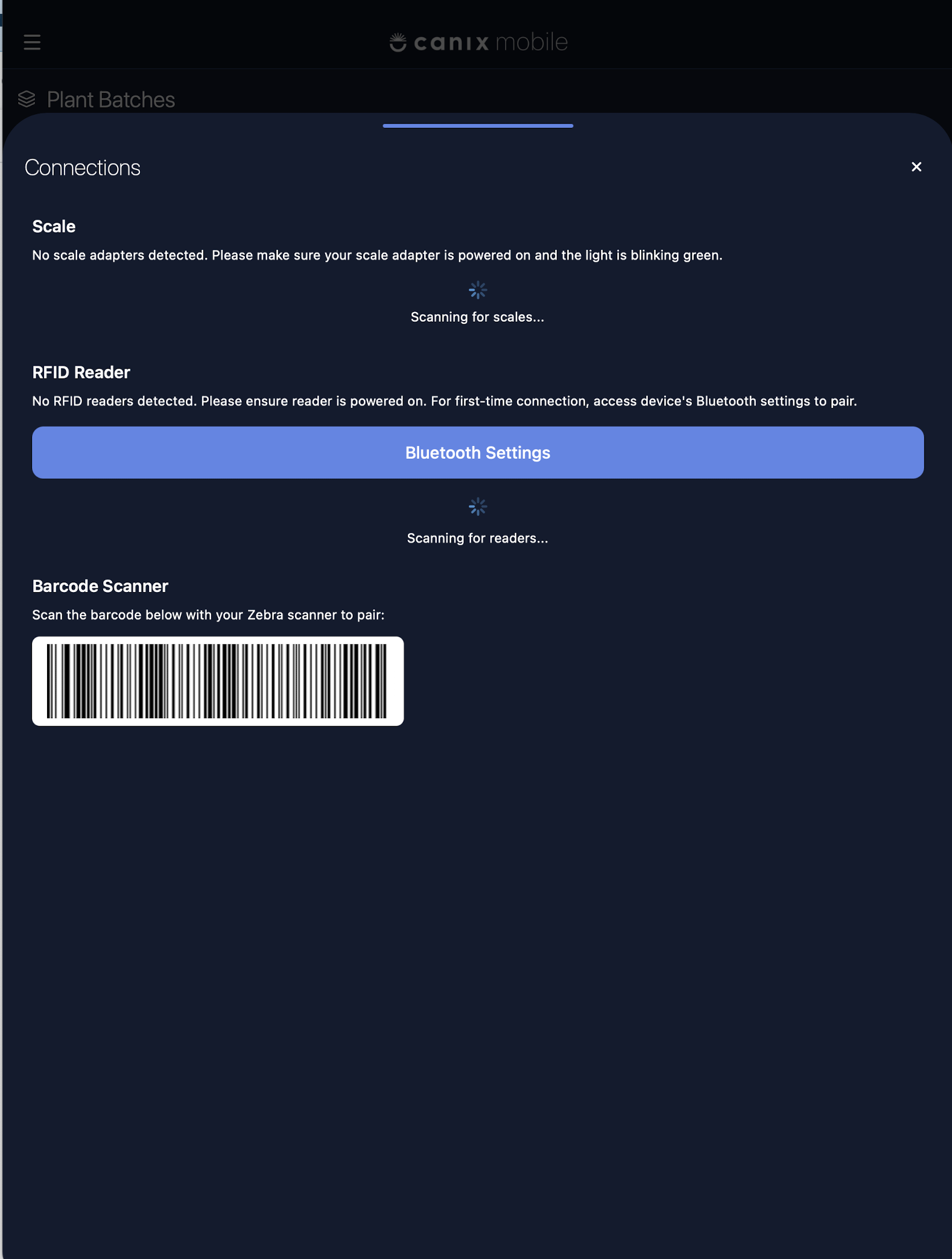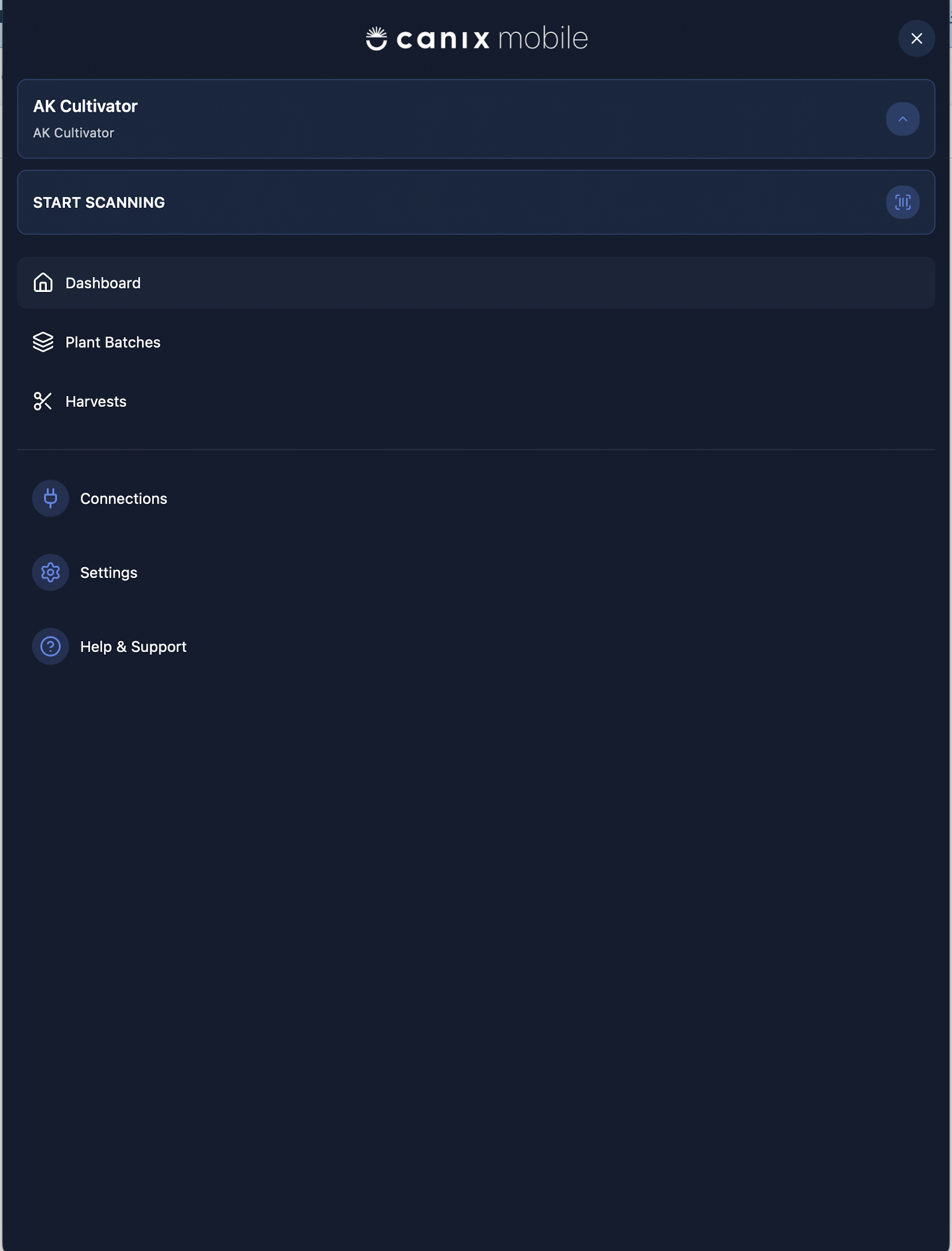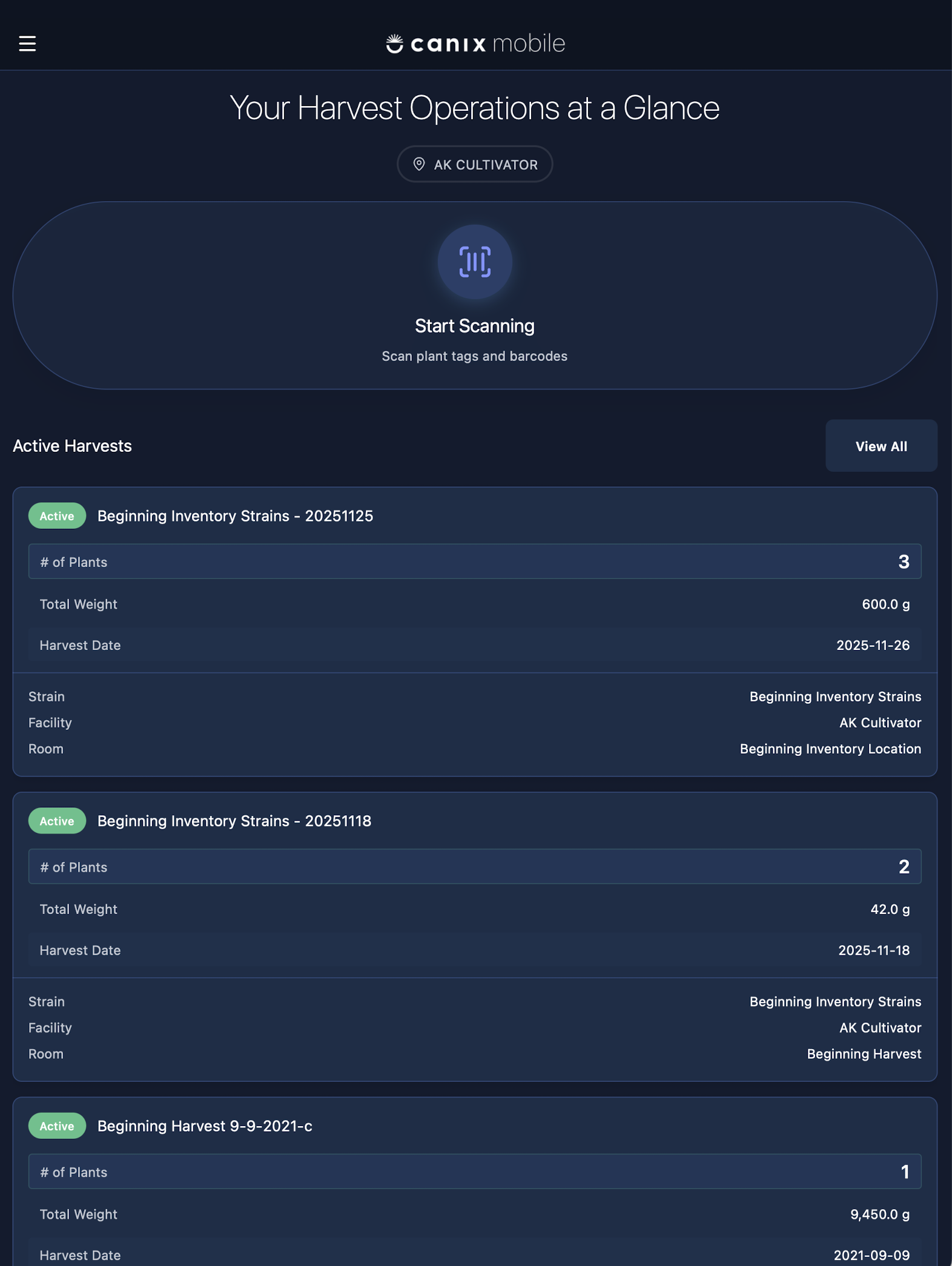 The Canix mobile app is designed to let you start taking actions as quickly as possible. Whatever action you're looking to take (Harvesting a Plant, Moving a Room) - Start Scanning will let you take that action in bulk after you select the relevant plant.