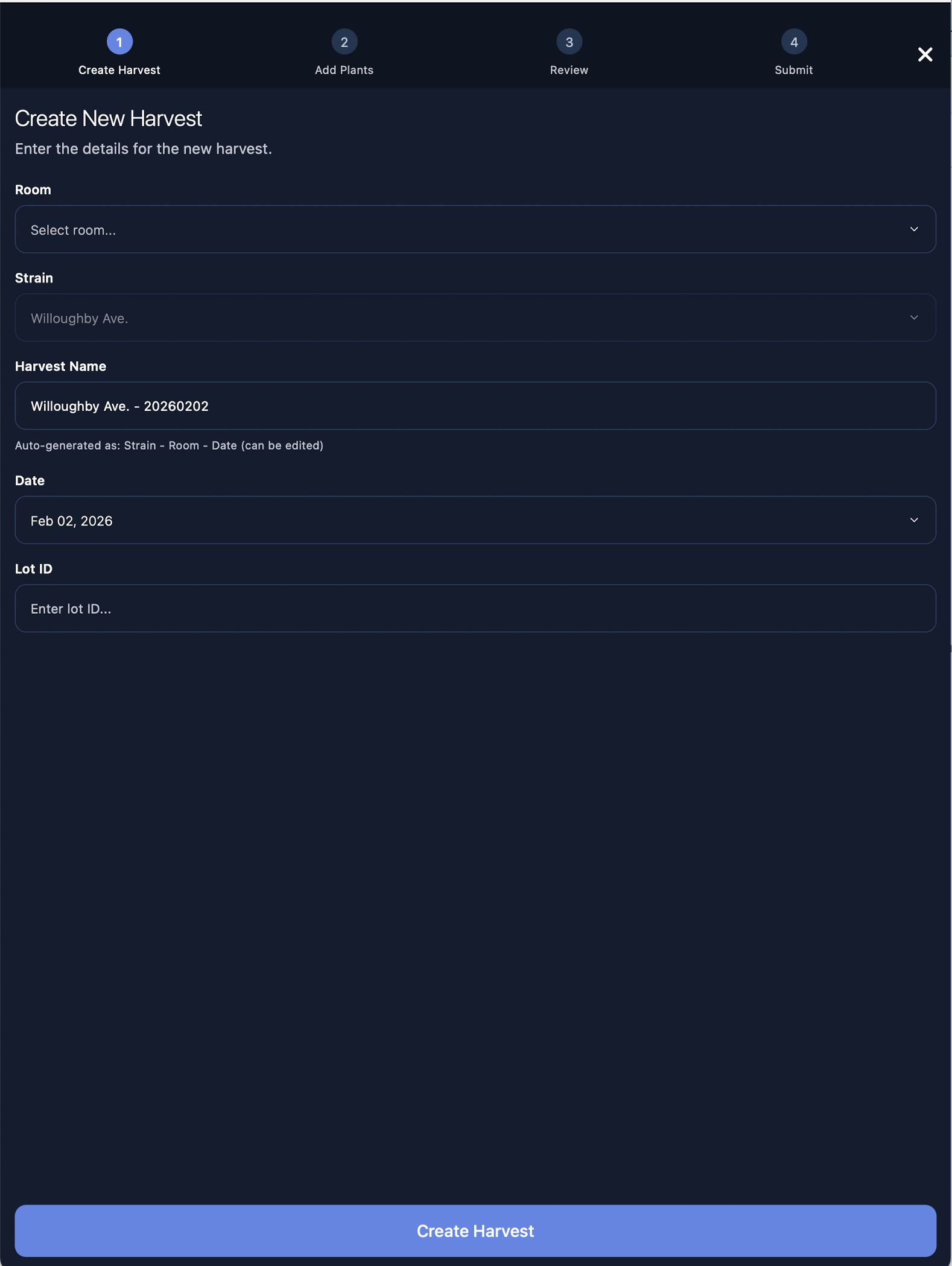 Based on the strain of the Plant selected, Canix will automatically recommend a harvest name.