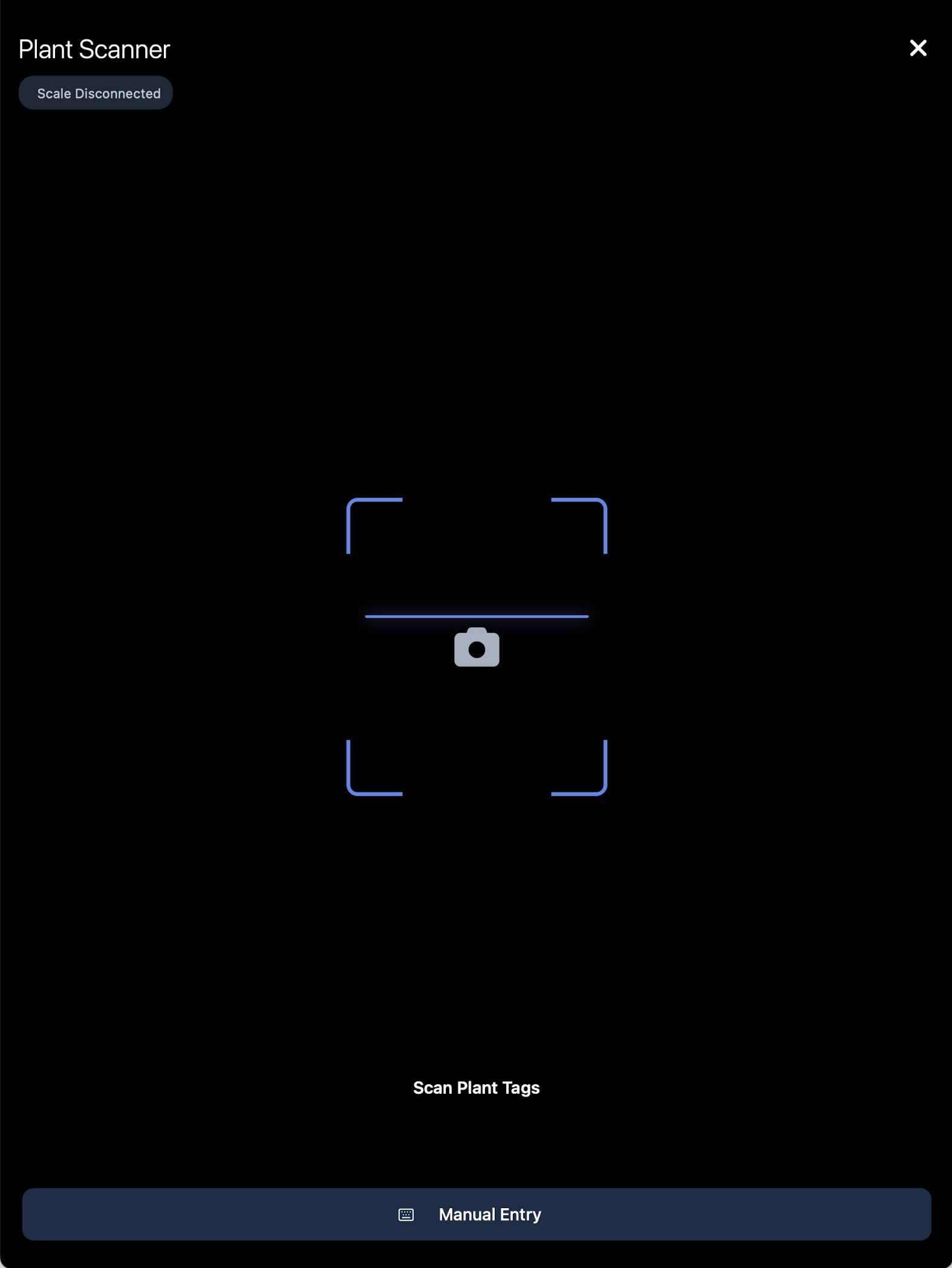 Click "Start Scanning" to scan Plant tags and barcodes. You will have the option to scan Metrc tags or manually enter the search string.