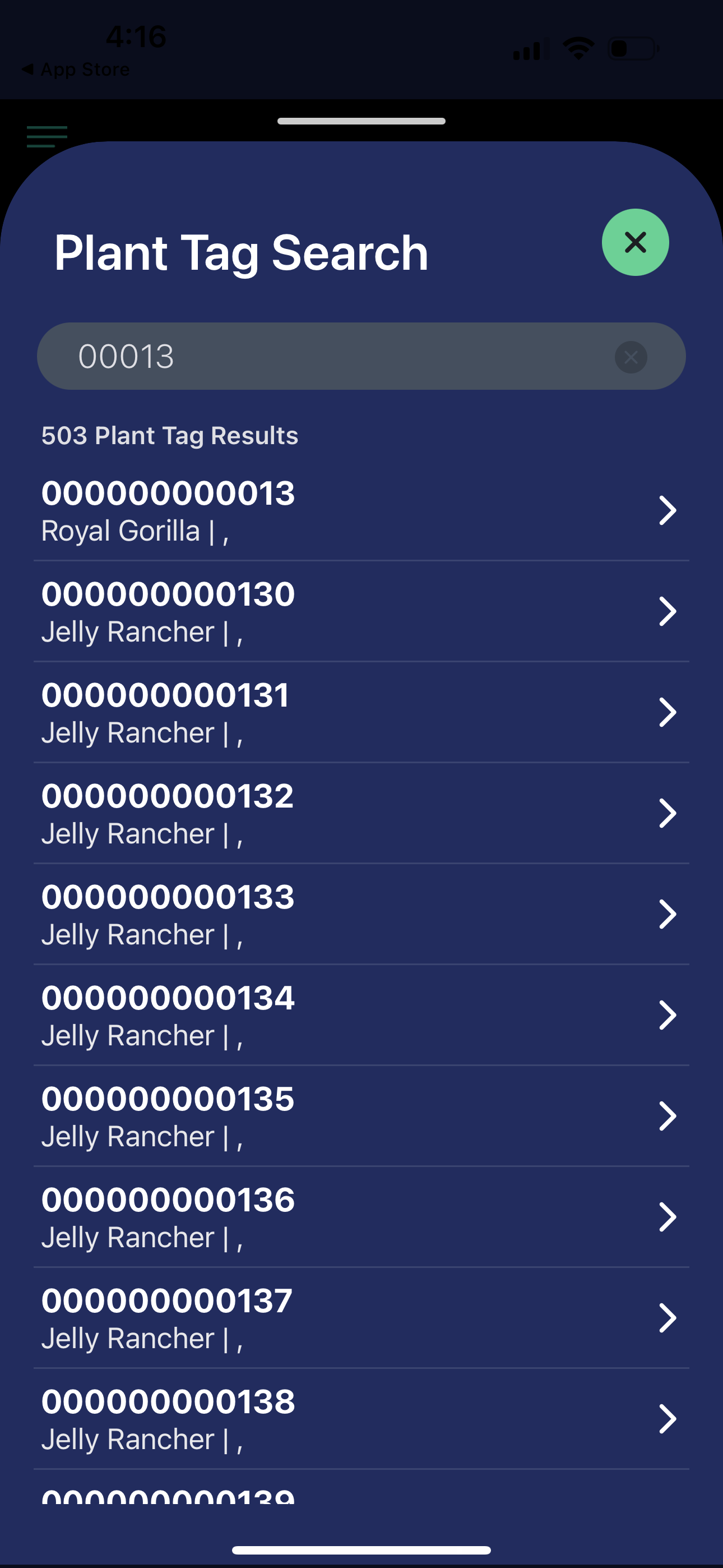 After clicking "Harvest", enter at least 5 digits of the plant tag that you are looking to find. Select the Plant Tag and use that to create your harvest