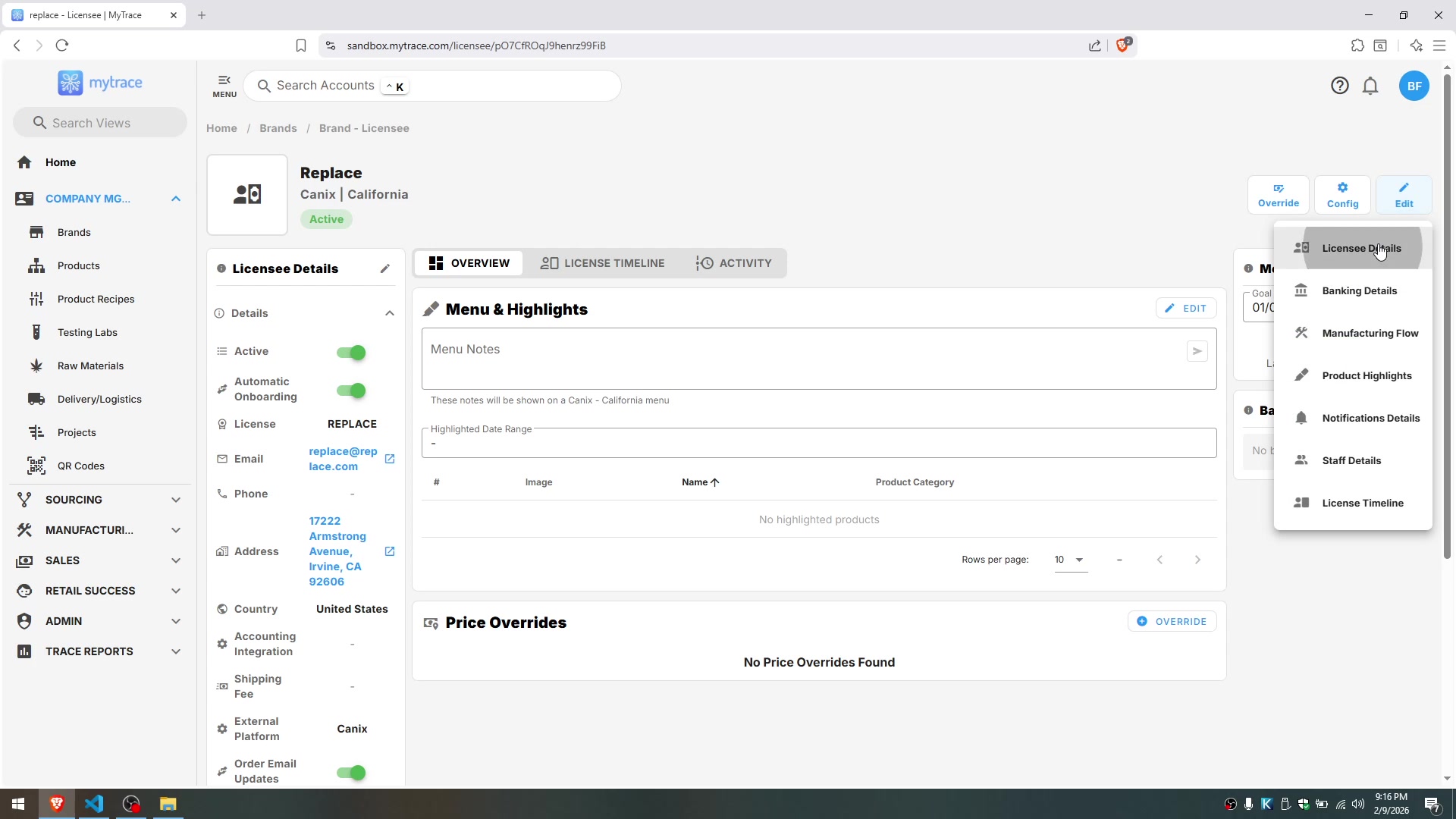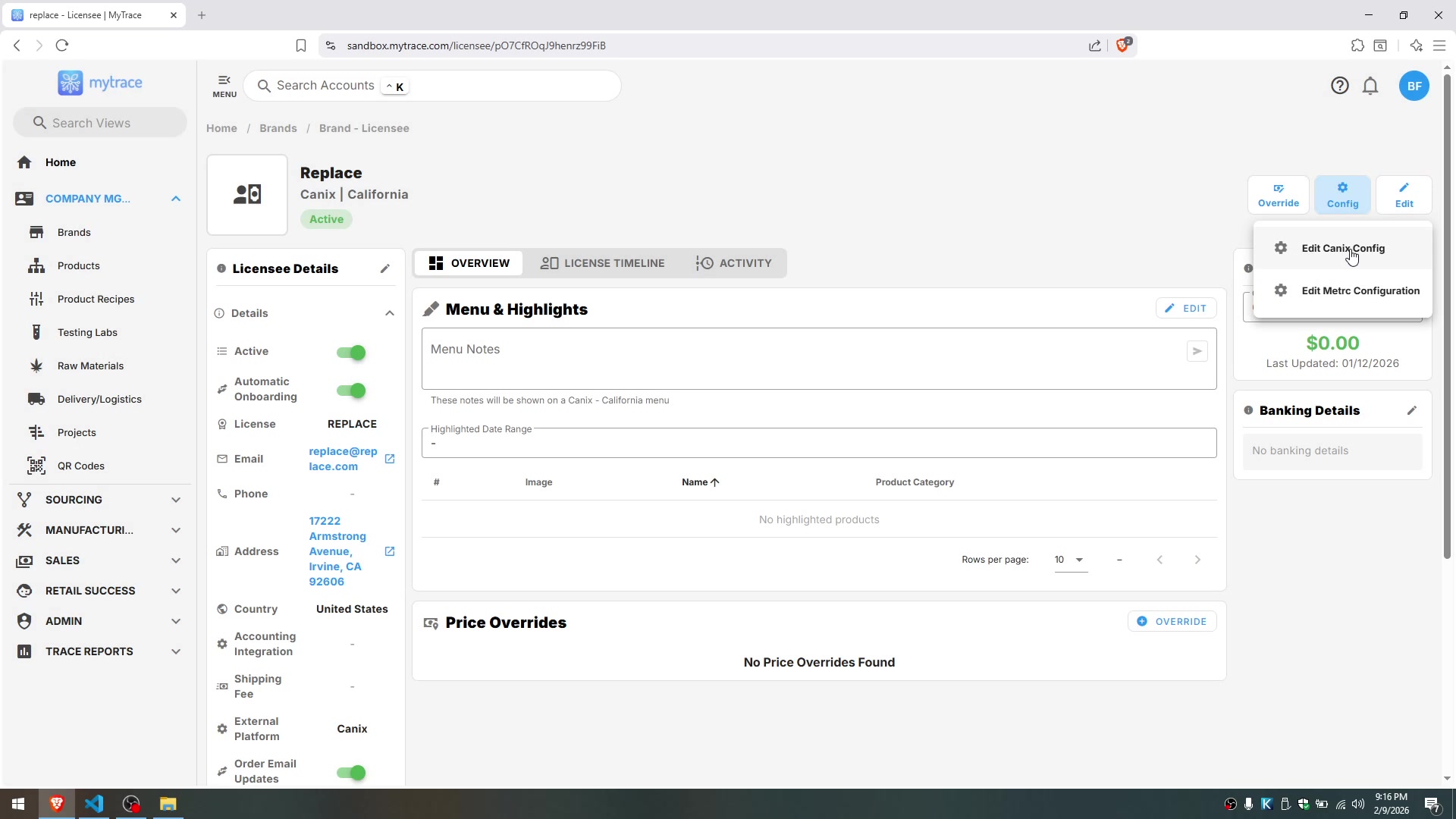 - Your brand (e.g., "Canix") has been created under Company Management > Brands in MyTrace, with at least one active licensee.