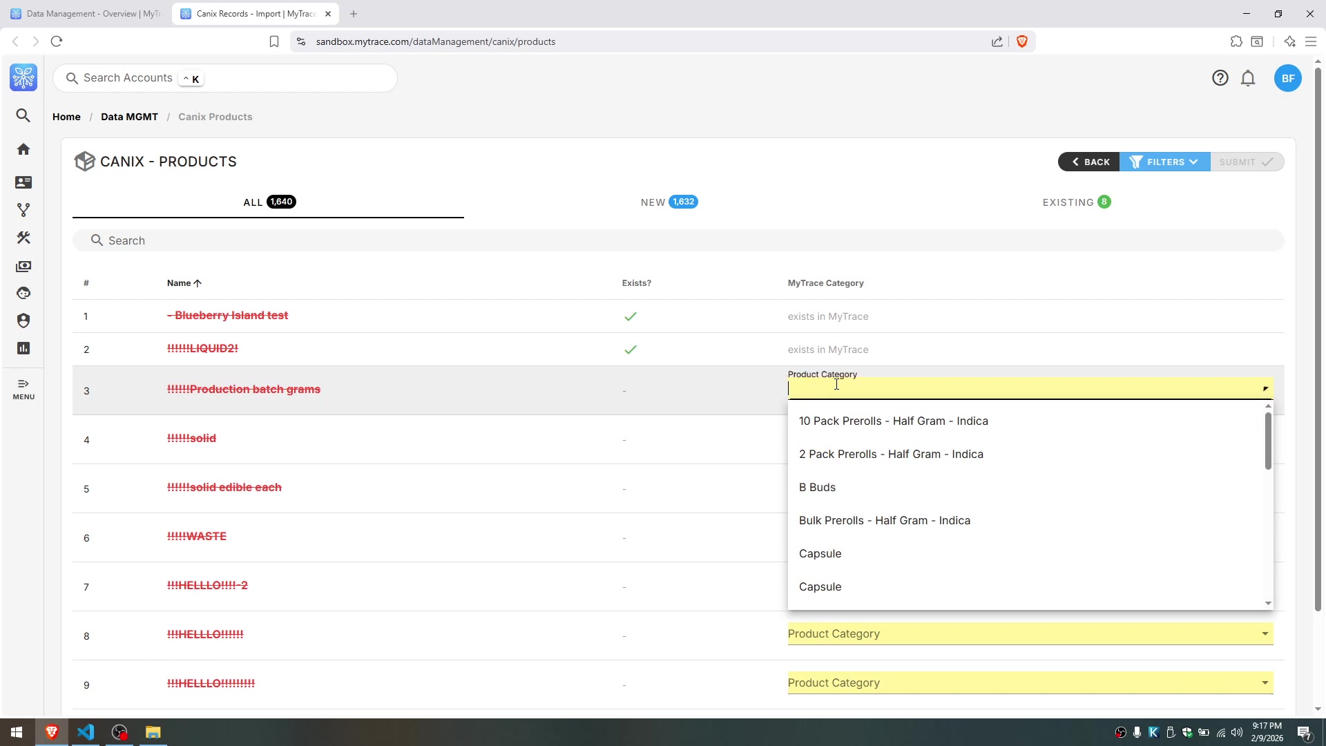 - Products that already exist in MyTrace will display "exists in MyTrace" instead of a dropdown.