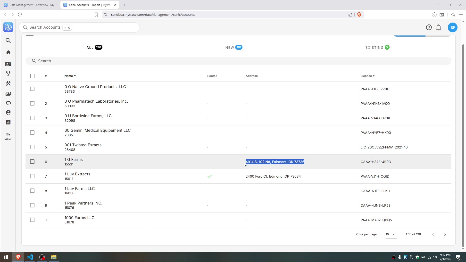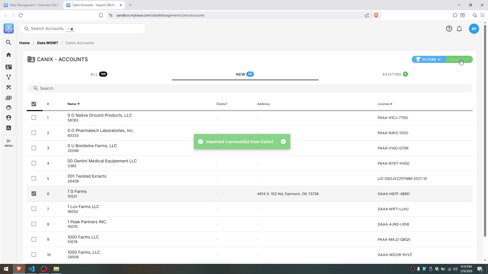 - MyTrace will display all accounts with tabs for All, New, and Existing counts. Each account shows its name, Canix ID, address, whether it already exists, and its license number.