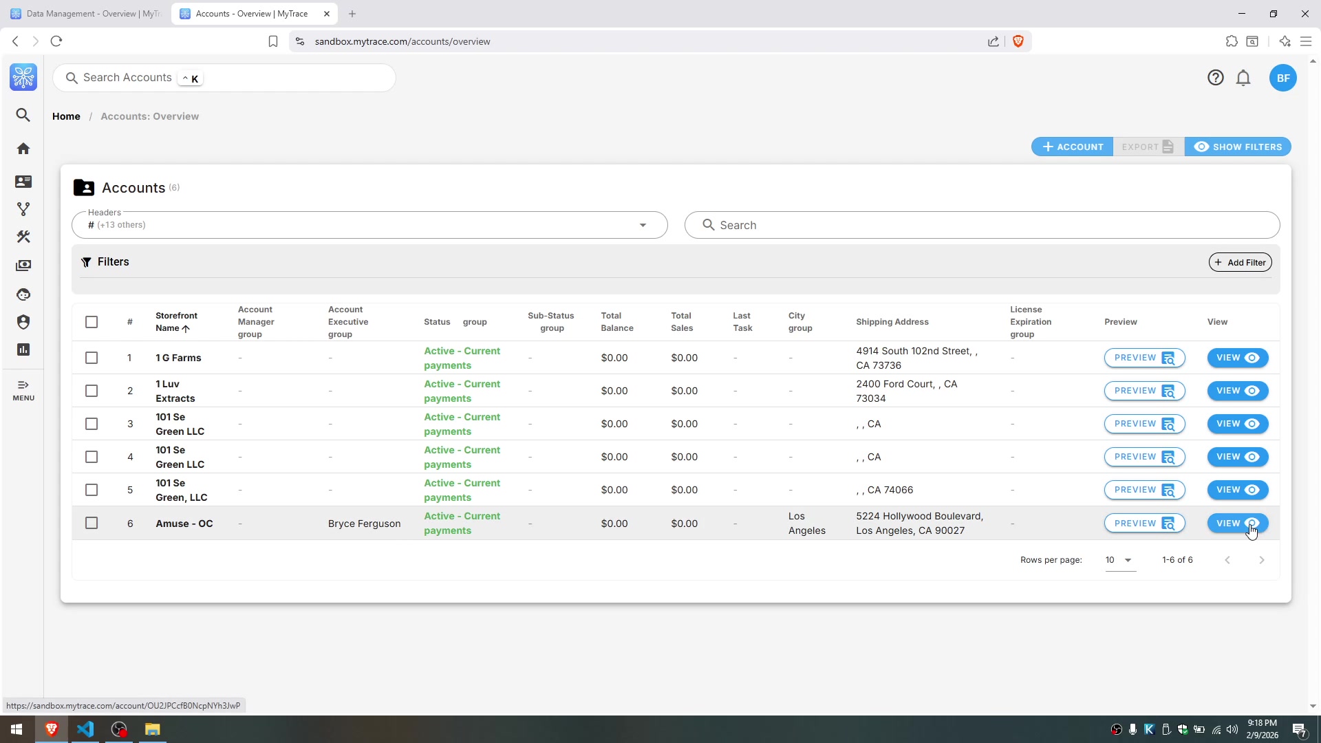 Imported accounts will appear under Sales > Accounts with a status of "Active – Current payments." Each account page displays details including email, license number, shipping address, brand assignment, and any recent orders.