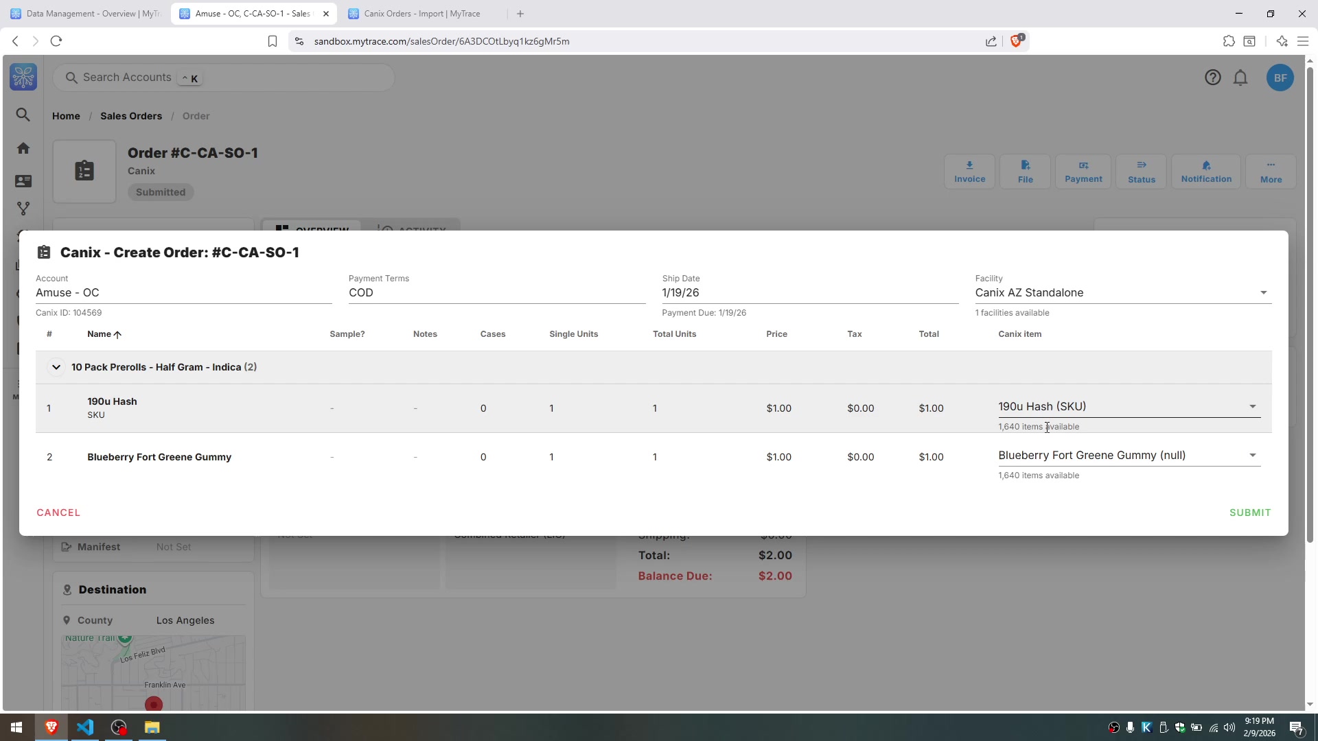 You can also create orders in Canix directly from a MyTrace sales order. This is useful when you need to sync a finalized or updated order back to your Canix account.