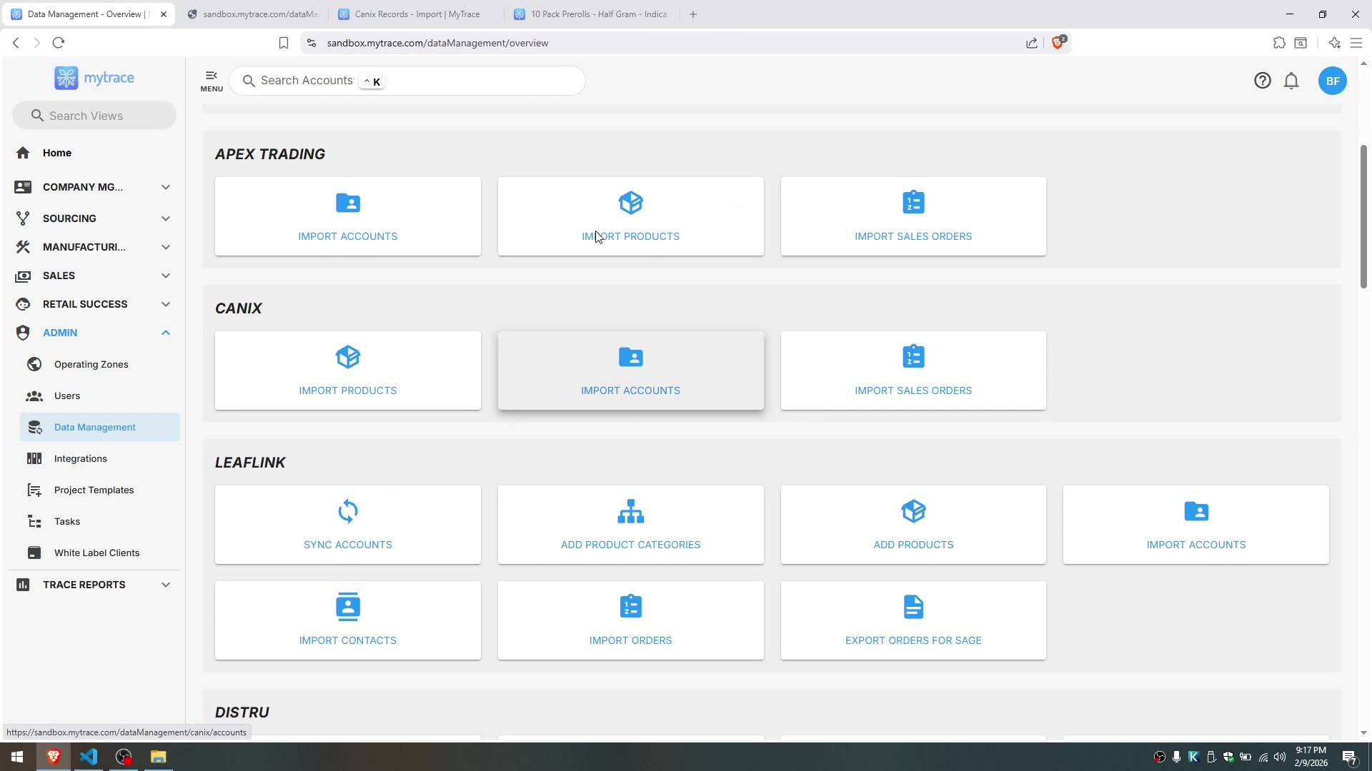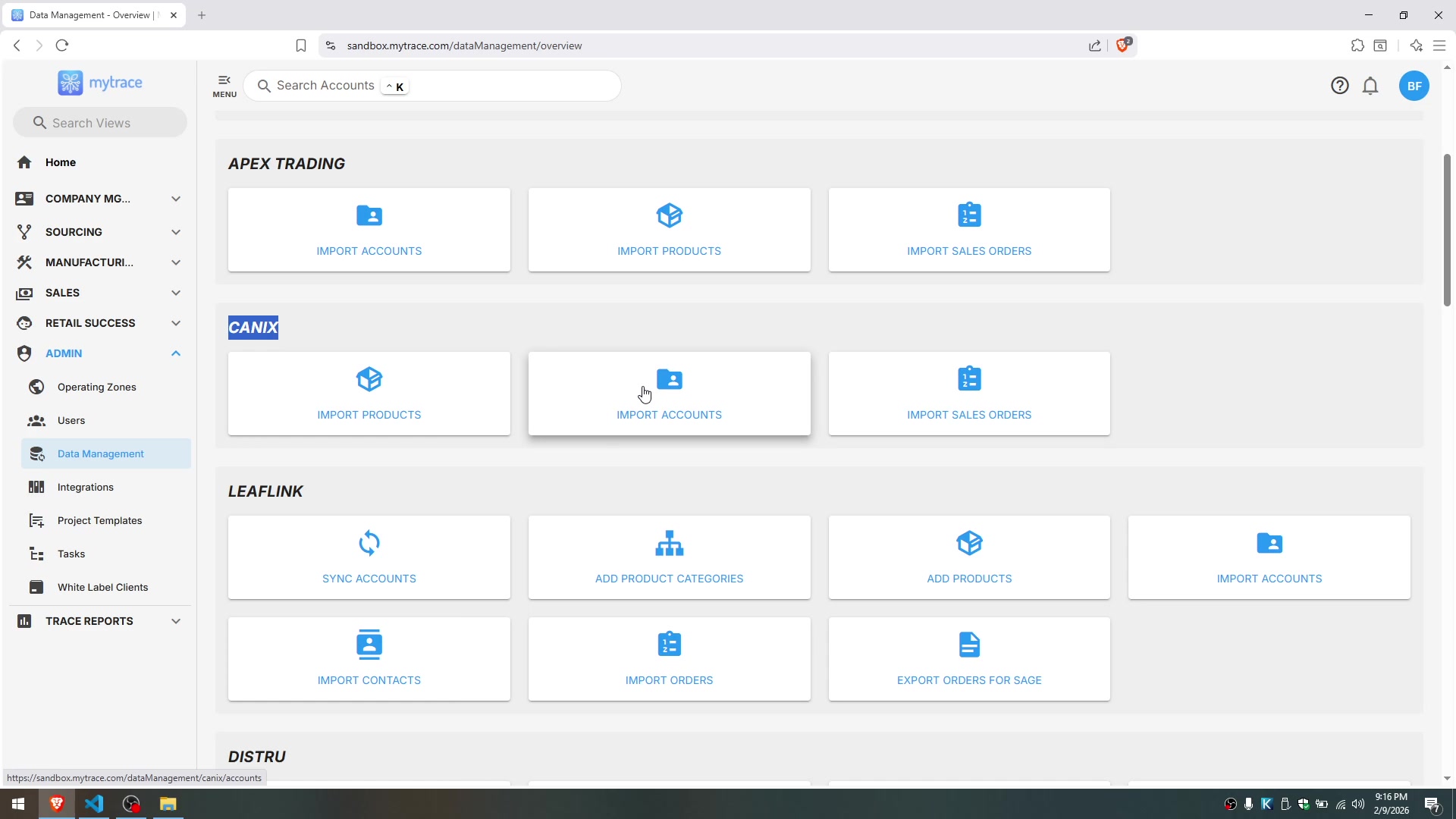 To begin, navigate to Admin > Data Management. Scroll to the Canix section where you'll see three import options: Import Products, Import Accounts, and Import Sales Orders.