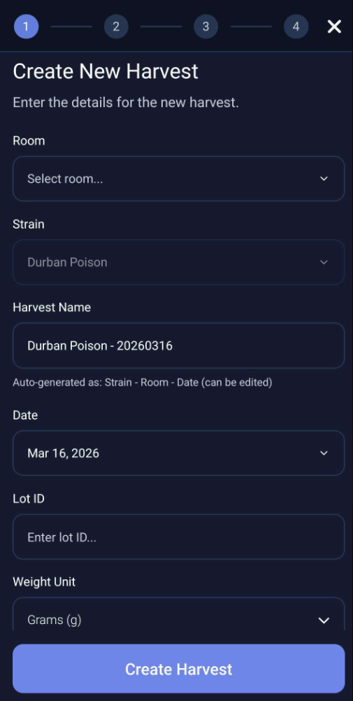 Enter the destination dry room for the harvest and any custom lot ID and Create Harvest.