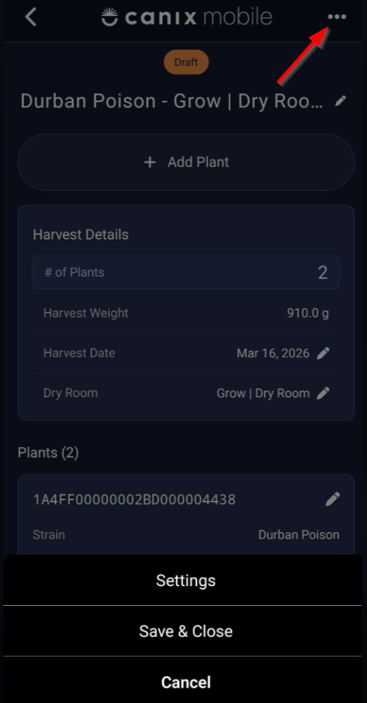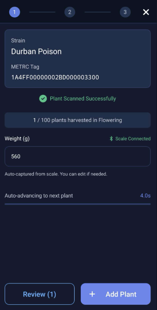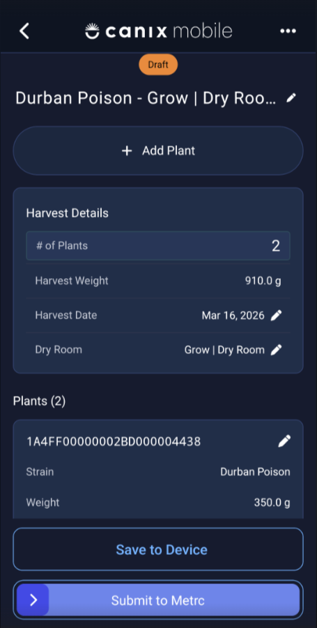 When completed, you can review the harvested plants, harvest information or continue adding plants until your harvest is ready to submit to Metrc. If not, you may also save the draft harvest to the device and continue later