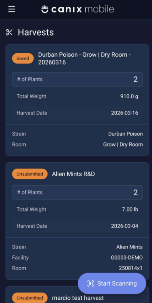 From the HARVESTS menu, you can view all harvests for the facility or license. This includes unsubmitted, active and harvests saved to the device. Only saved harvests on the device can be edited.
