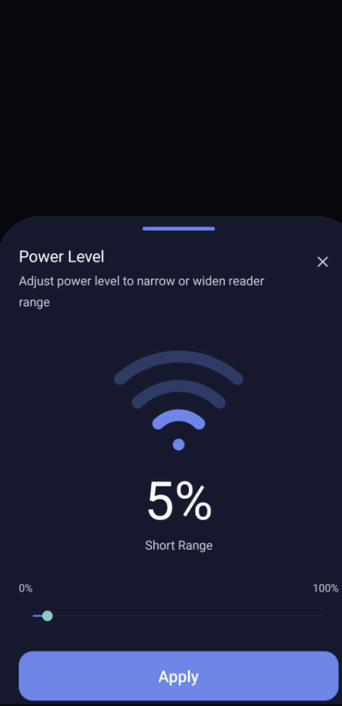 When an RFID reader is connected, the reading range (power level) can be adjusted to minimize picking up unwanted tags. Use the ((o)) menu icon to access the power level settings.