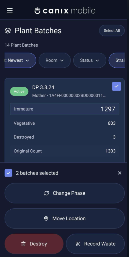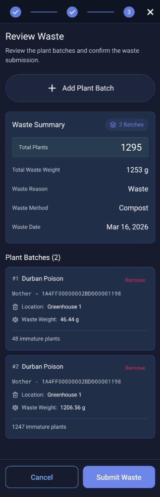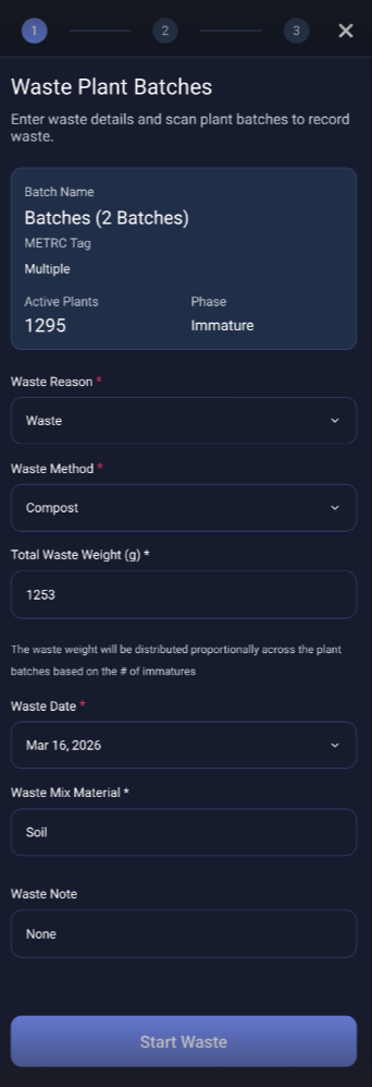Similar to the Destroy flow above, select batches you want to record waste for and enter the required information. Enter the total combined waste weight for the selected plant batches. The waste weight will be distributed proportionally across the plant batches based on the number of immatures