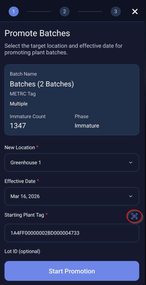 After starting the promotion, you may add or remove any additional plant batches (tag scan or manual entry) you may have. Starting and ending tag numbers are provided for easy reference.