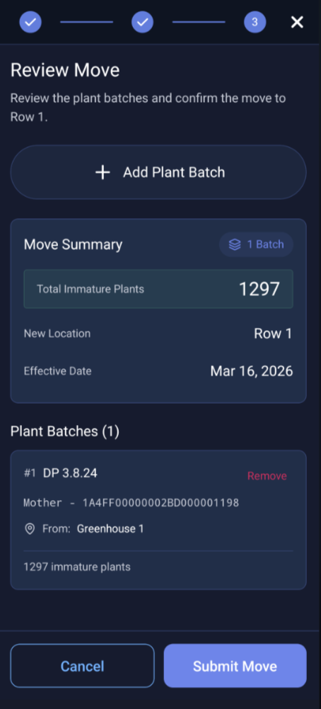 To move plant batch locations select one or more batches and enter the destination location. You may add (tag scan or manual entry) or remove additional batches to the move before submitting