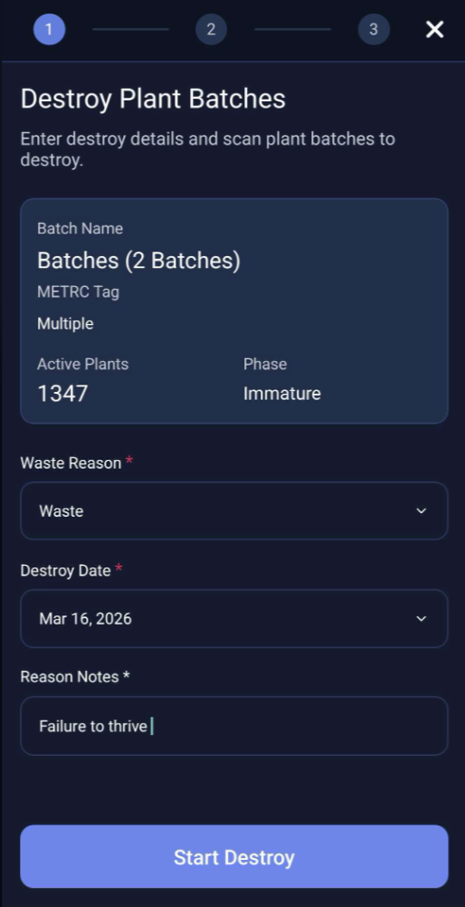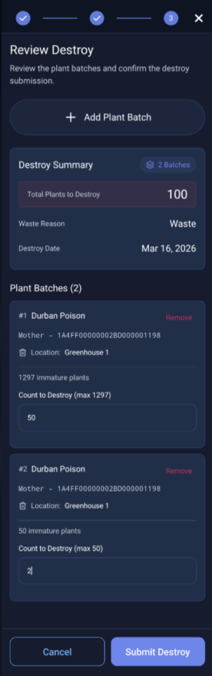 Enter the Count to Destroy for each plant batch on the second step of the flow. Submit Destroy to complete.
