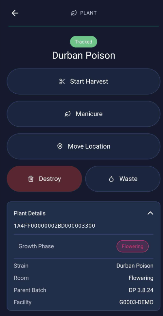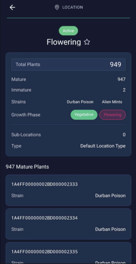 From the LOCATIONS menu, you can organize and view plant information in you facility or license locations. Use the star icon on a location card to save it as a favorite. Select a card to view the plant and batch information in the location.