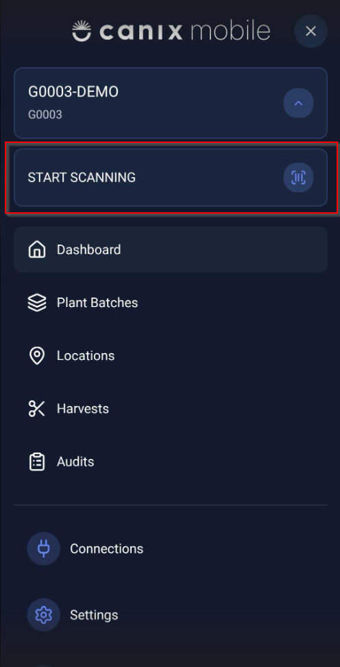 From the "Start Scanning" option in the drawer menu, scan your first plant tag to pre-populate harvest information (a). Alternatively you can start from the DASHBOARD and select Create Harvest in the PLANTS section to Create Harvest and start entering harvest information (b).