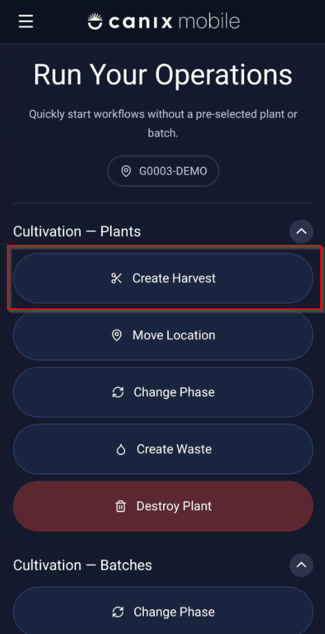 Enter the destination dry room for the harvest and any custom Lot ID then Create Harvest.